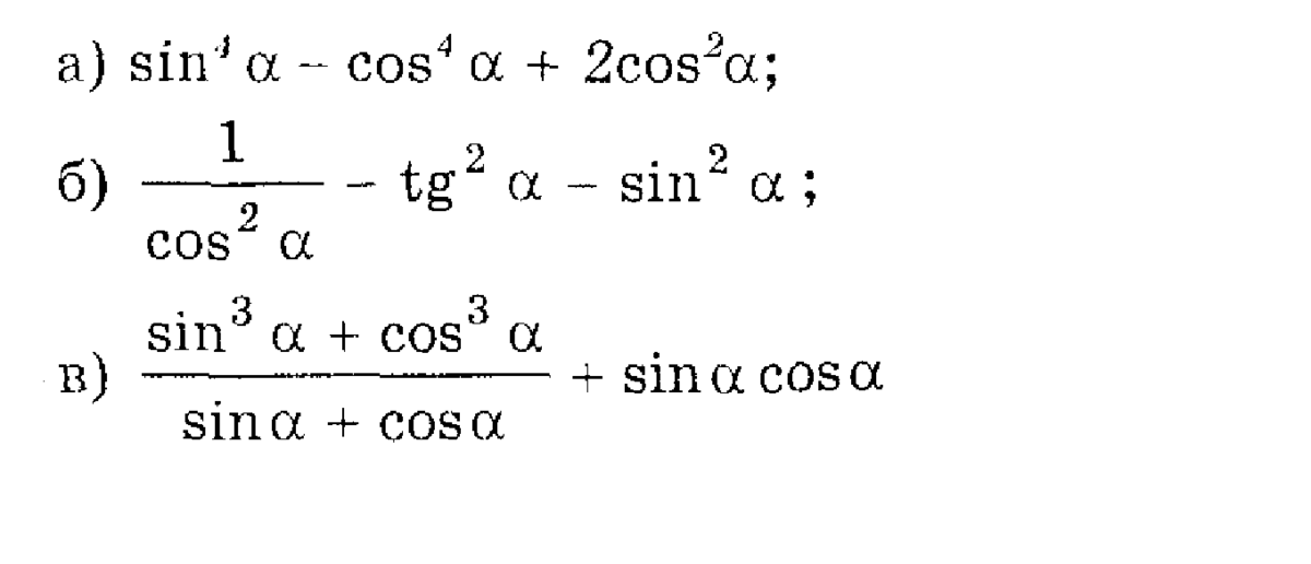 В задании б) тангенс представьте как синус в квадрате, делённый на косинус в квадрате . Получите две дроби с одинаковым знаменателем. Вычтите числители. Получите 1 минус синус в квадрате. Из основного тригонометрического тождества следует,что это косинус в квадрате. И в знаменателе тоже косинус в квадрате, т.е выражение равно 1. Осталось из 1 вычесть синус в квадрате, получаем косинус в квадрате. Это и есть ответ(альфа не называла, сами допишете)