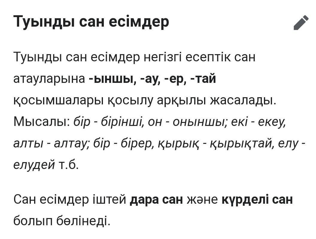 Туынды сан есімдер негізгі есептік сан атауларына ЫН-ШЫҢ, АУ, ЕР, ТАЙ қосымшалар қосылу арқылы жасалады. Мысалы... Бір бірінші, он оныншы. Екі екеу, алты алтау, бір біреу, қырық қырықтай, елу елудей т. б.