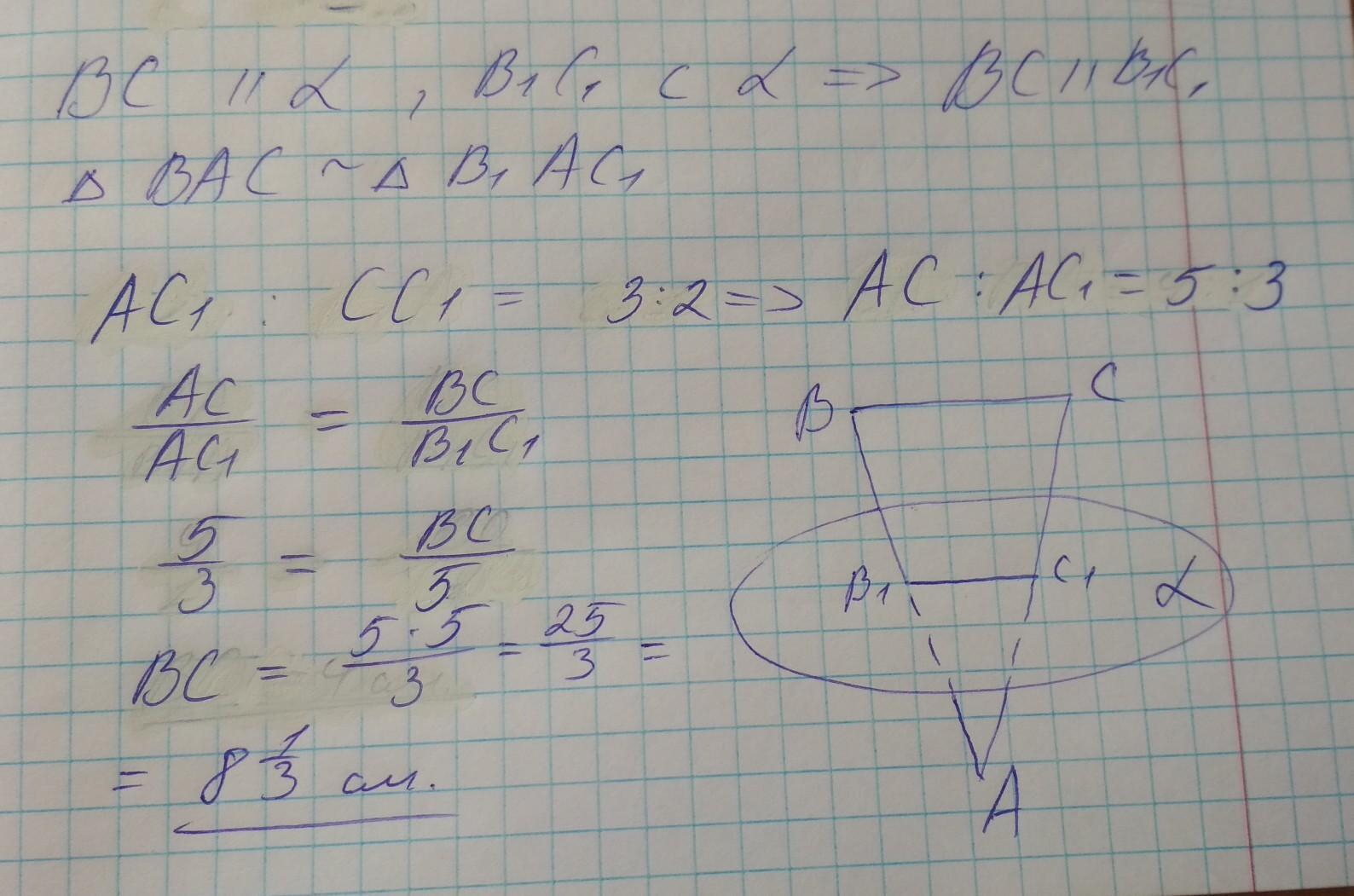 Площина альфа перетинає сторни АВ і АС трикутника АВС у точках В1 і С1 відповідно, причому АС1:СС1=3:2 і В1С1=5 см. Знайдіть відрізок ВС, якщо пряма ВС і площина альфа паралельні