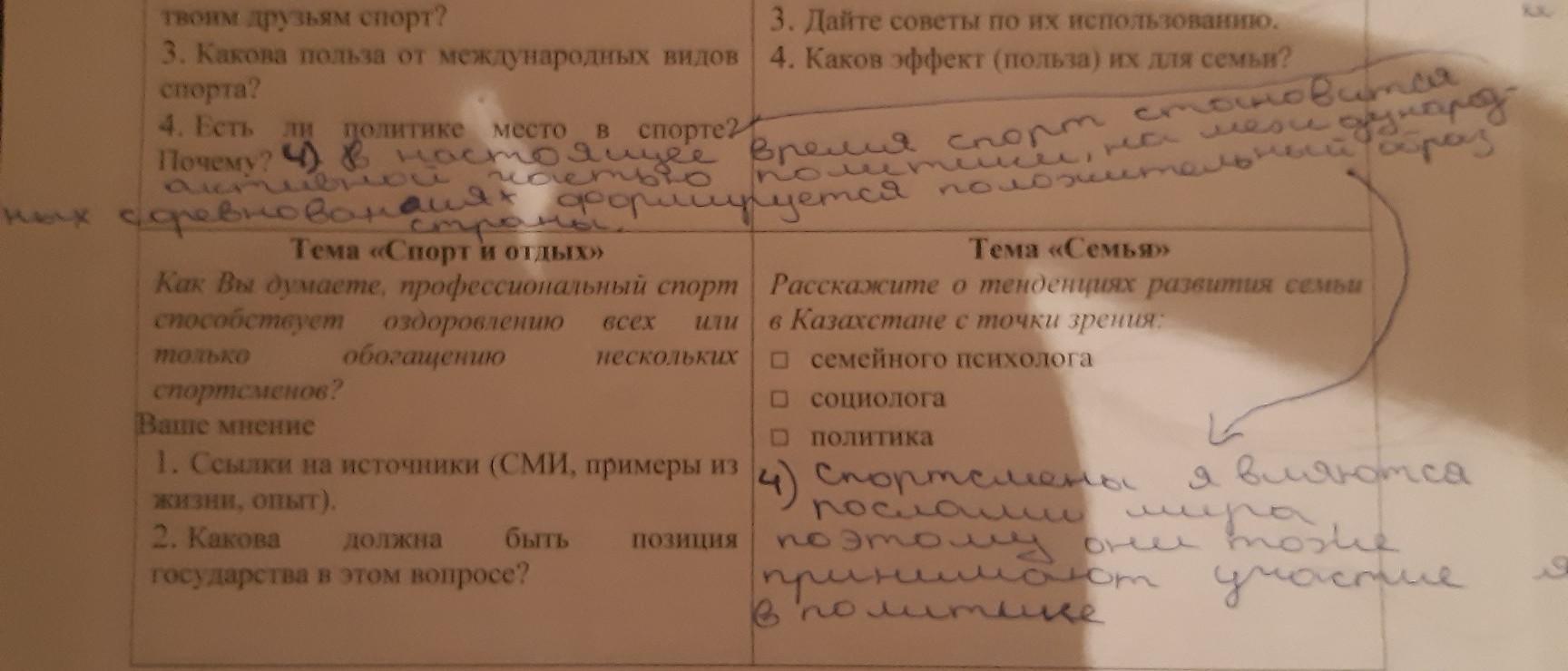 Говорение Задание Создайте аргументированное высказывание, опираясь на вопросы, составленные на основе изученных тем. Правильно используйте в речи синтаксические конструкции, включающие правила согласования и управления, употребления причастных и деепричастных оборотов. У вас есть 2 минуты для подготовки и три минуты для устного ответа. Во время подготовки ответа можете делать записи, но времени на записи у вас очень ало. Тема «Спорт и отдых» Участвуешь ли ты в каком-либо виде спорта как игрок или как зритель? 1. Почему ты принимаешь (не принимаешь) участие в соревнованиях? 2. Какую (сще) пользу приносит тебе и твоим друзьям спорт? 3. Какова польза от международных видов спорта? 4. Есть ли политике место в спорте? Почему? Тема «Спорт и отдых» Как Вы думаете, профессиональный спорт способствует оздоровлению всех или только обогашщению нескольких спортсменов? Ваше мнение 1. Ссылки на источники (СМИ, примеры из жизни, опыт). 2. Какова должна быть позиция государства в этом вопросе? Тема «Семья» Как новые технологии влияют (не влияют) на жизнь семьи? 1. О каких технологиях Вы могли бы рассказать? 2. Каковы их достоинства? Недостатки? 3. Дайте советы по их использованию. 4. Каков эффект (польза) их для семьи? Тема «Семья» Расскажите о тенденциях развития семьи в Казахстане с точки зрения: о семейного психолог социолога о политика