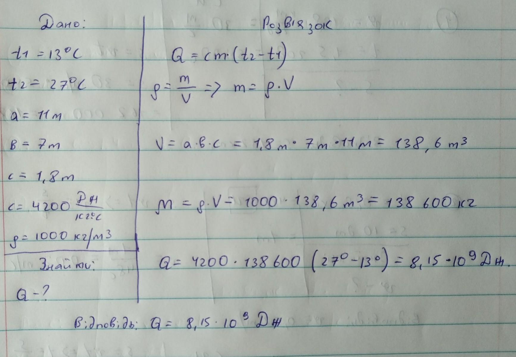 Определи, какое количество теплоты пойдёт на нагревание воды от 13°C до 27°C в бассейне, длина которого — 11 м, ширина — 7 м и глубина — 1,8 м. Удельная теплоёмкость воды равна 4200 Дж/(кг·°C), плотность воды — 1000 кг/м³.