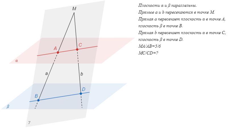 Прямые a и b пересекаются в точке М. Плоскости a и b параллельны. Прямая a пересекает плоскость а в точке А, а плоскость b в точке В. Прямая b пересекает плоскость a в точке С, а плоскость b в точке D. AM/AB=5/6. Найдите MC/CD