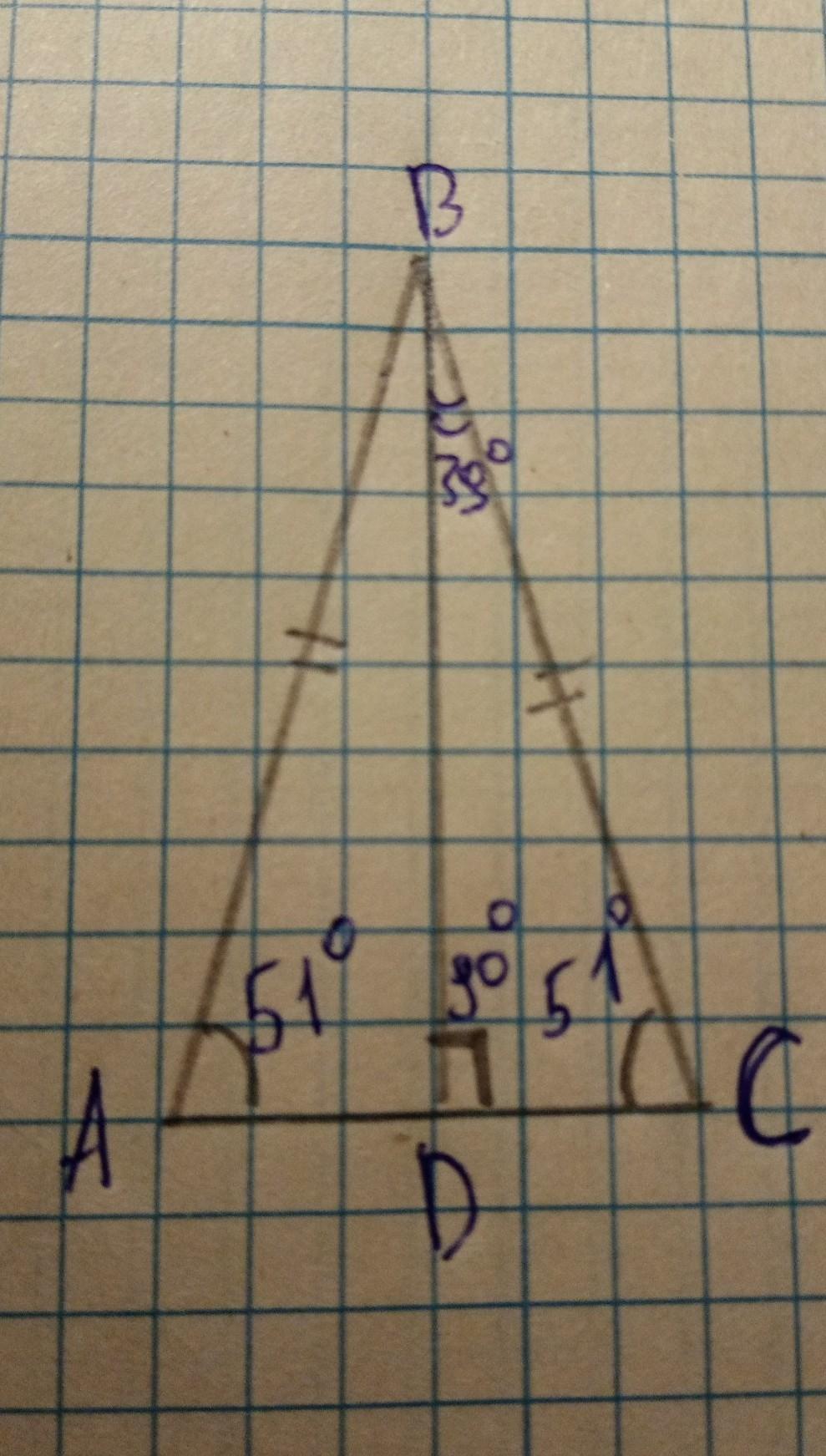 В равнобедренном треугольнике ABC проведена высота к основанию AC, длина основания равна 42 см, ∡CBD=39°.