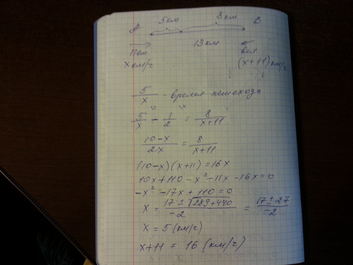 4.Из пункта А в пункт В, расстояние между которыми 13 км, вышел пешеход. Одновременно навстречу ему из В в А выехал велосипедист. Велосипедист ехал со скоростью, на 11 км/ч большей скорости пешехода, и сделал в пути получасовую остановку. Найдите скорость велосипедиста, если известно, что они встретились в 5 км от пункта А.