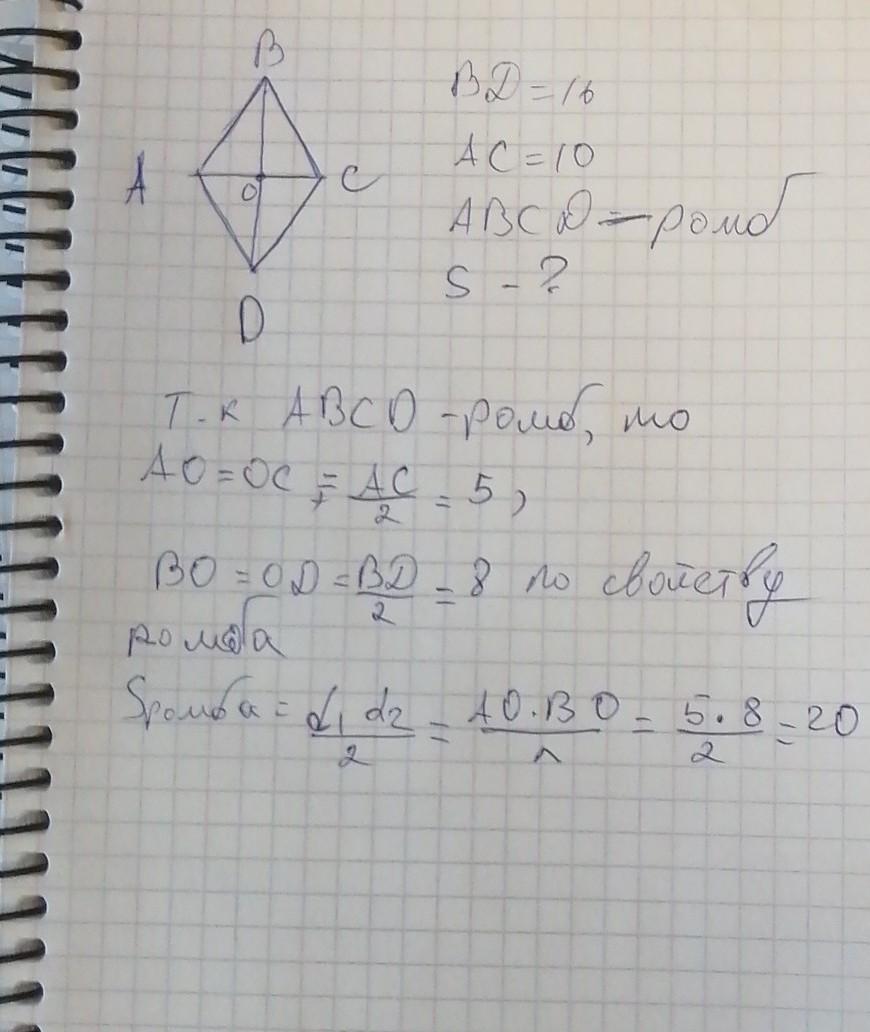 Помогите пожалуйста!!! Найди площадь ромба, диагонали которого равны 16 и 10 (запиши ответ в виде десятичной дроби).