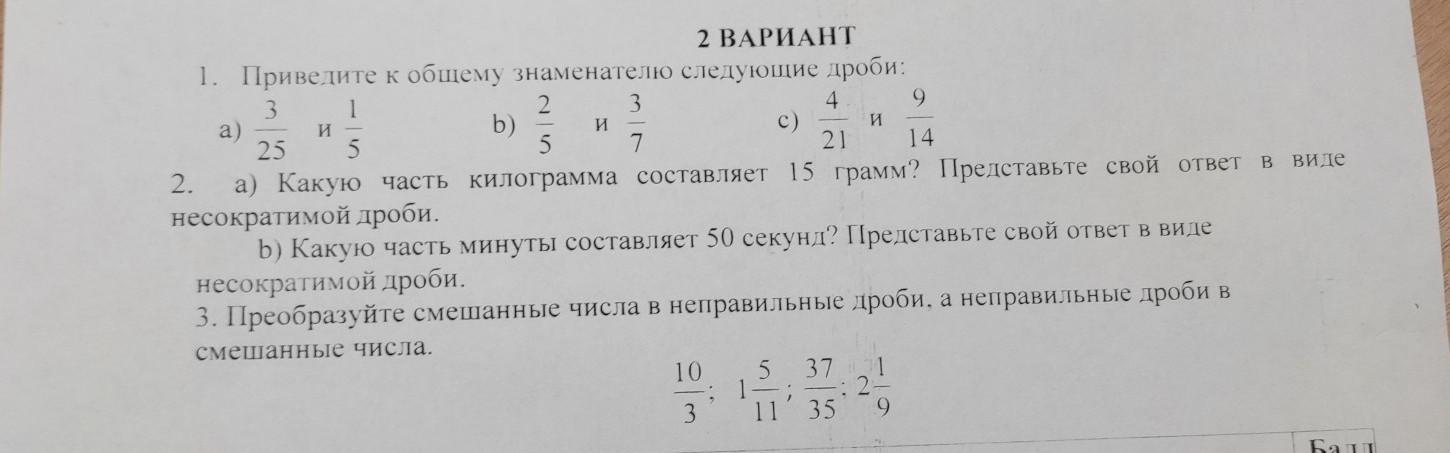 а) 3/25 и 5/25 б) 14/35 и 15/35 в) 8/42 и 27/42