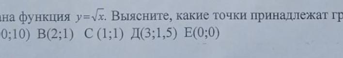 Дана функция у=√х.Выясните, какие точки принадлежат графику функции А(100;10) В(2;1) С(1;1) Д(3;15) Е(0;0)