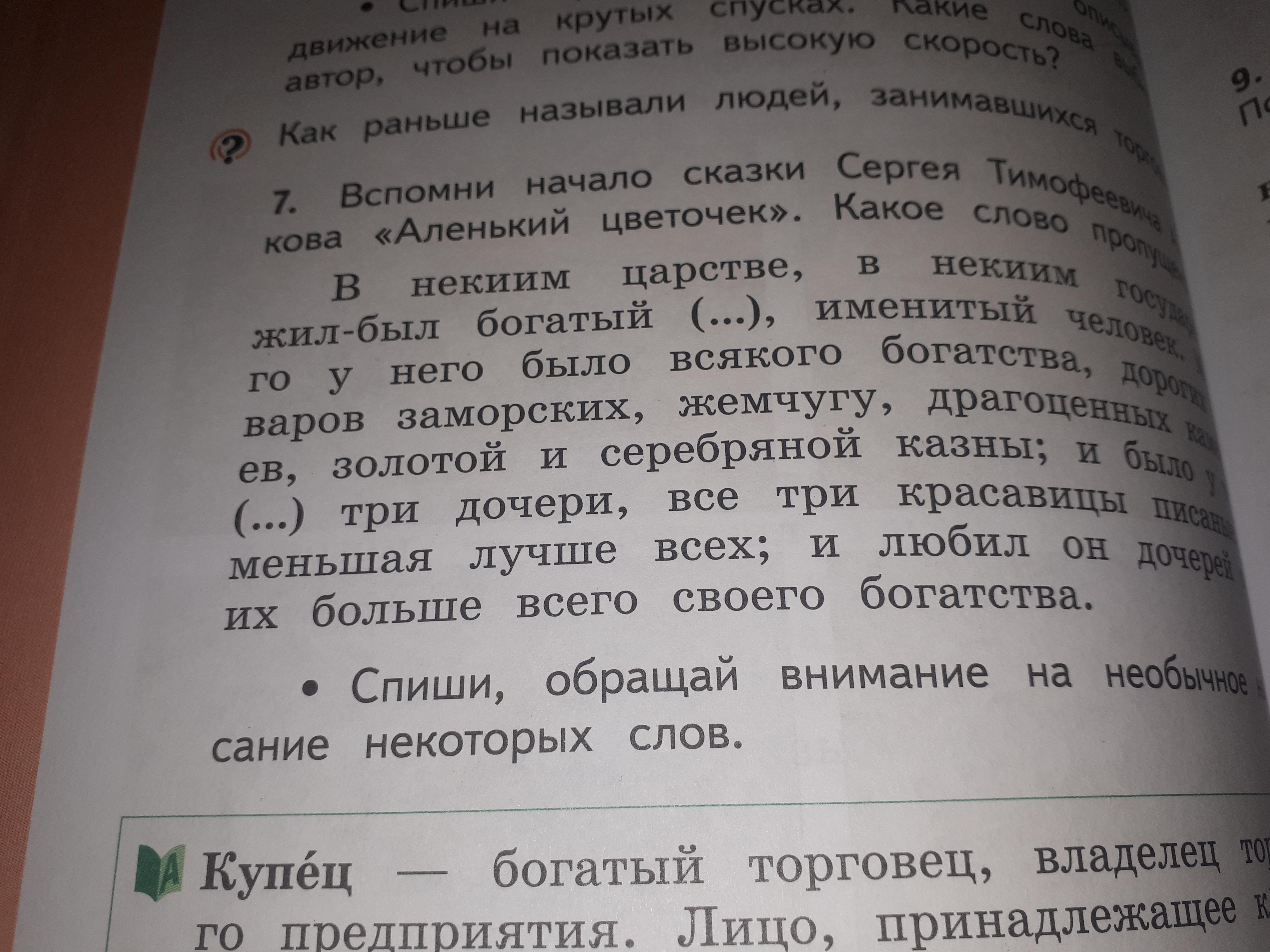 В некиим царстве, в некиим государстве жил-был богатый купец, именитый человек. (мне не видно здесь) у него было всякого богатства, дорогих варов заморских, жемчугу, драгоценных камнев, золотой и серебряной казны; и было у него три дочери, все три красавицы писаных, меньшая лучше всех; и любил он дочерей их больше всего богатства.