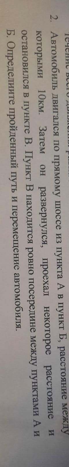 Автомобиль двигался по прямому шоссе из пункта A в пункт Б, расстояние между которыми 10км. Затем он развернулся, проехал некоторое расстояние и остановился в пункте В. Пункт В находиться ровно по середине между пунктами А и Б. определите пройденный путь и перемещение автомобиля.