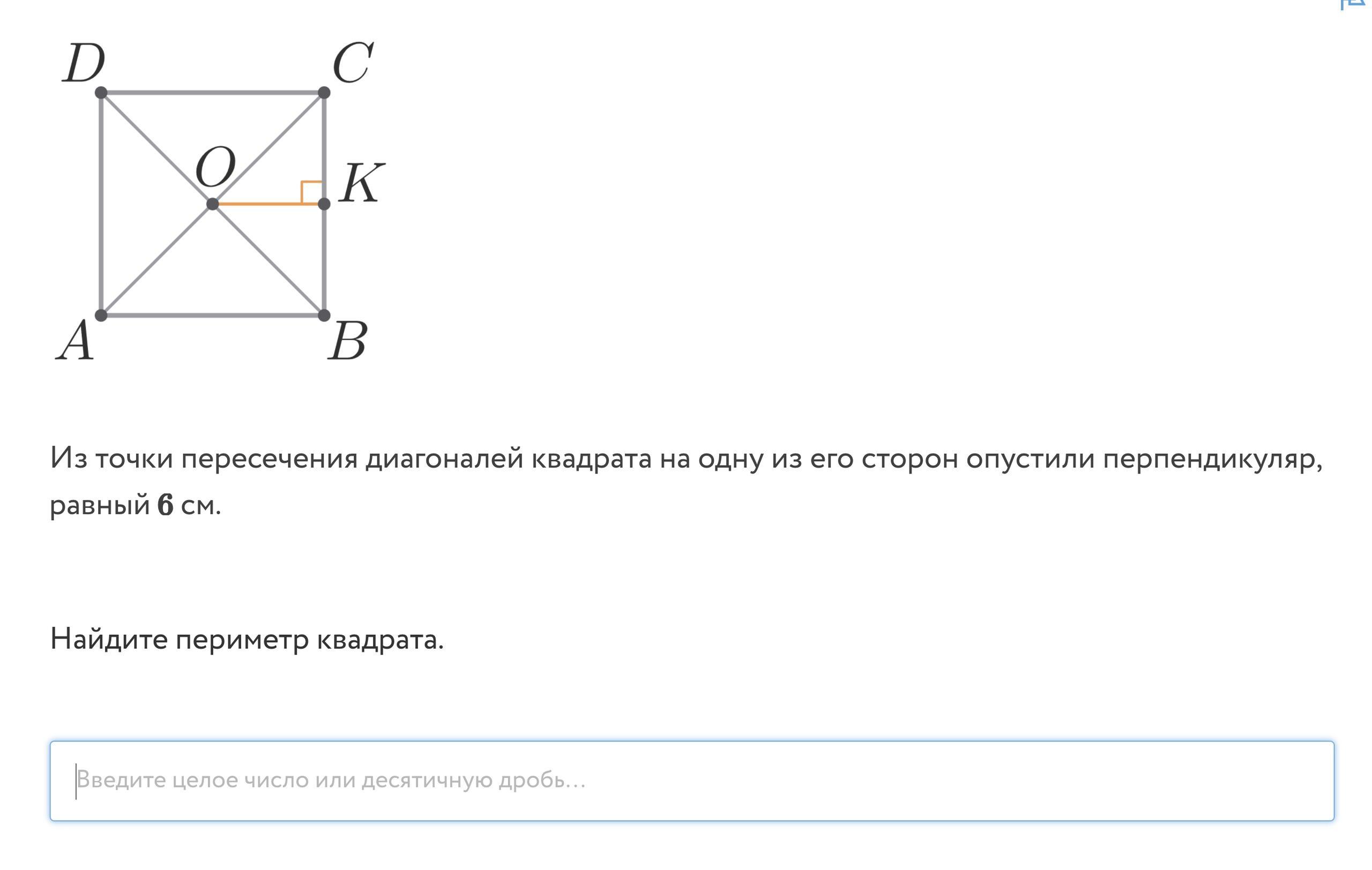 В данном случае перпендикуляр является половиной стороны квадрата, то есть каждая сторона его составляет 12 см.