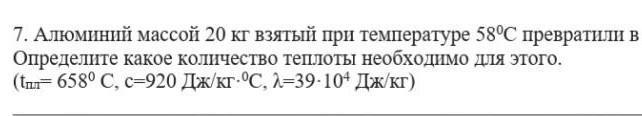 Алюминий массой 20 кг при температуре 58°С превратили в жидкое состояние определите какое кол-во теплоты необходимо для этого