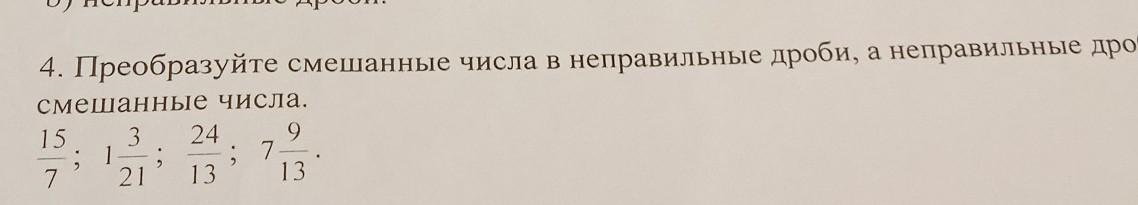 переоброзуйте смешанные числа в неправильные дроби, а неправильные дроби в смешанные числа 15/7 ¹3/21 24/13 ⁷9/13
