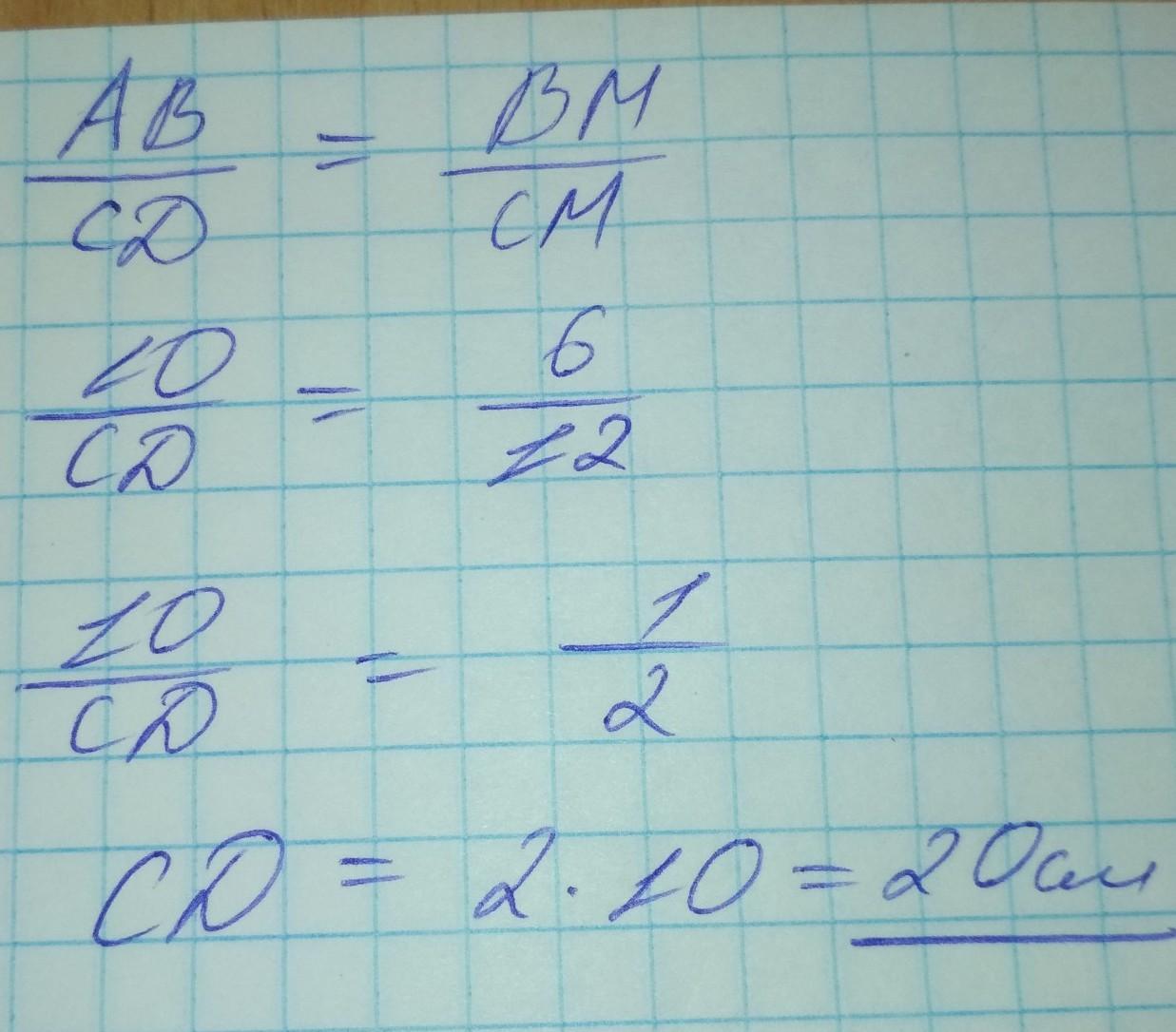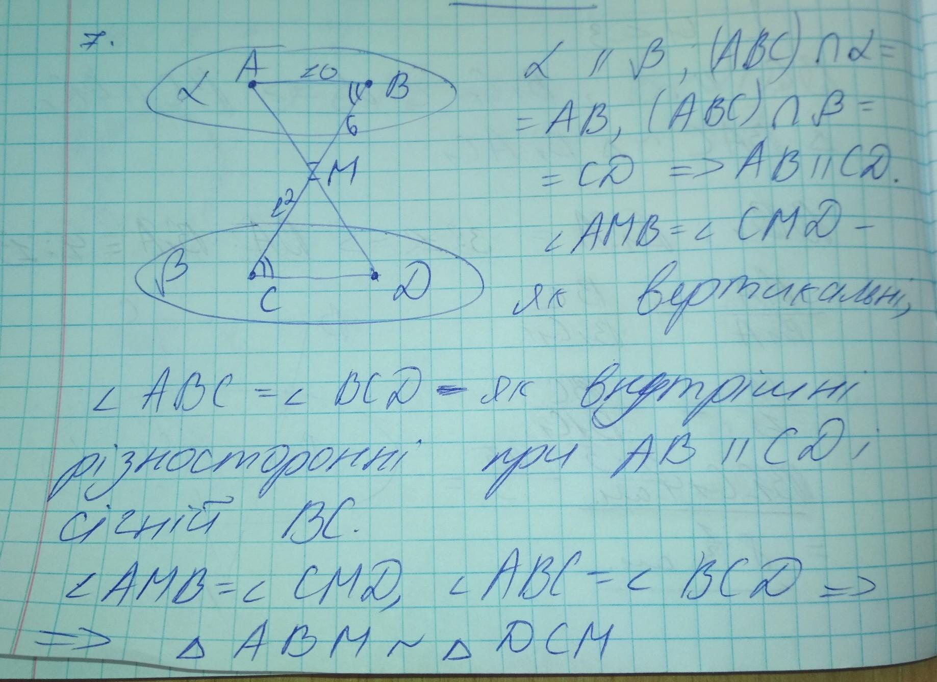 Дано дві паралельні площини α і β. Точки А і В належать площині α, точки С і D — площині β. Відрізки AD і ВС перетинаються в точці М, АВ=10см, BM=6см, CM = 12см. Знайти довжину відрізка CD. ПОМОГИТЕ