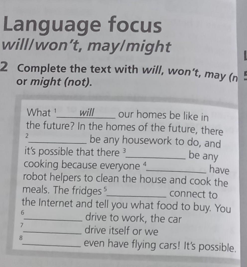 What will our homes be like in the future? In the homes of the future, there won't be any housework to do, and it's possible that there might not be any cooking because everyone will have robot helpers to clean the house and cook the meals. The fridges will connect to the Internet and tell you what food to buy. The alarm clock will read your daily schedule and know what time you need to get up for work. You won't drive to work, the car will drive itself or we may even have flying cars! It's possible.