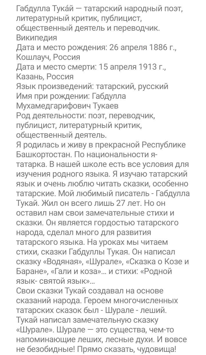 Написать сочинение про "Габдулла Тукай - мой любимый писатель" на татарском языке, можно просто простыми словами написать его биографию и почему он мне нравится. Содержания нужно на 2.5 страницы, могу растянуть слова