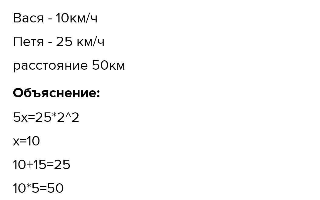 «Пётр и Василий любят ездить в выходной день на велосипедах из одного населённого пункта в другой. Расстояние между двумя городами Пётр проехал за 2 ч., а Василий — за 5 ч. Скорость Василия на 24 км/ч меньше скорости Петра. Найди скорости Василия и Петра и расстояние между городами».