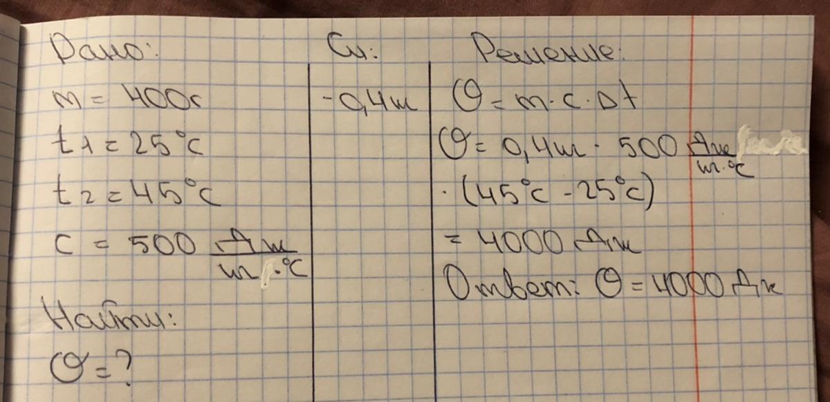 Рассчитайте количество теплоты, необходимое для нагревания стального резца массой 400 г, если при закалке его нагрели от температуры 25"С до температуры 45°С,
