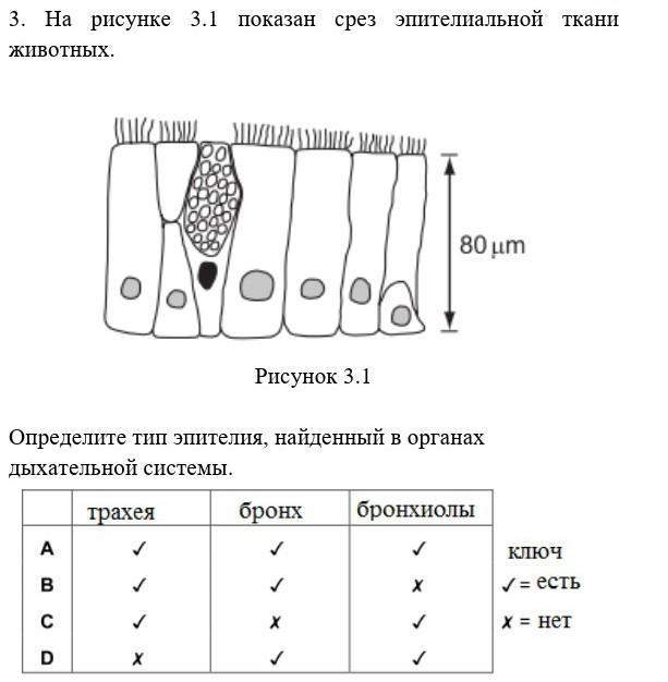 На рисунке 3.1 показан срез эпителиальной ткани животных. Рисунок 3.1 Определите тип эпителия, найденный в органах дыхательной системы.