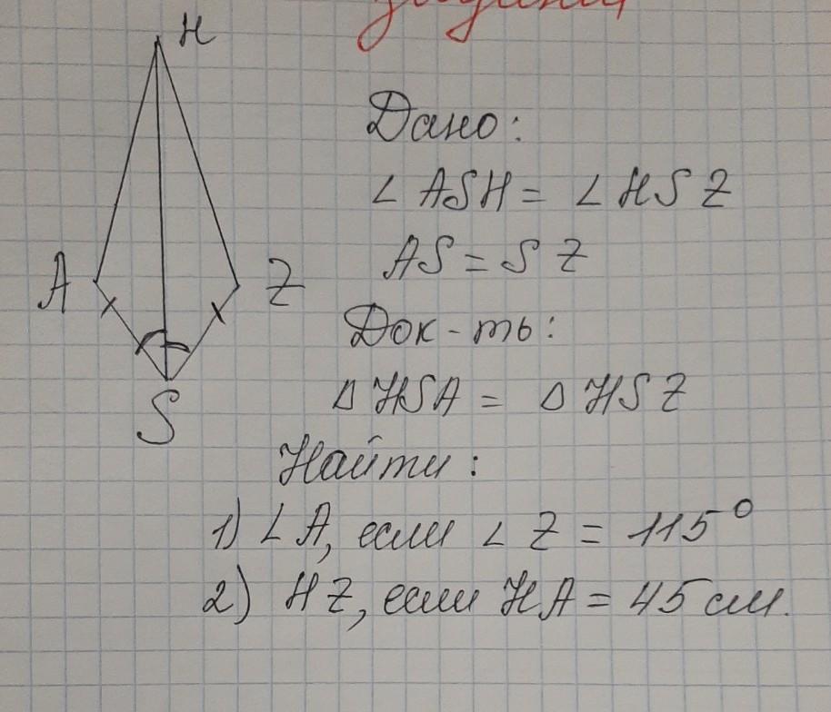 AS = HZ, угол HSA = углу HSZ, сторона HS - общая, значит ∆HSA = ∆HSZ (за двумя сторонами и углом между ними)