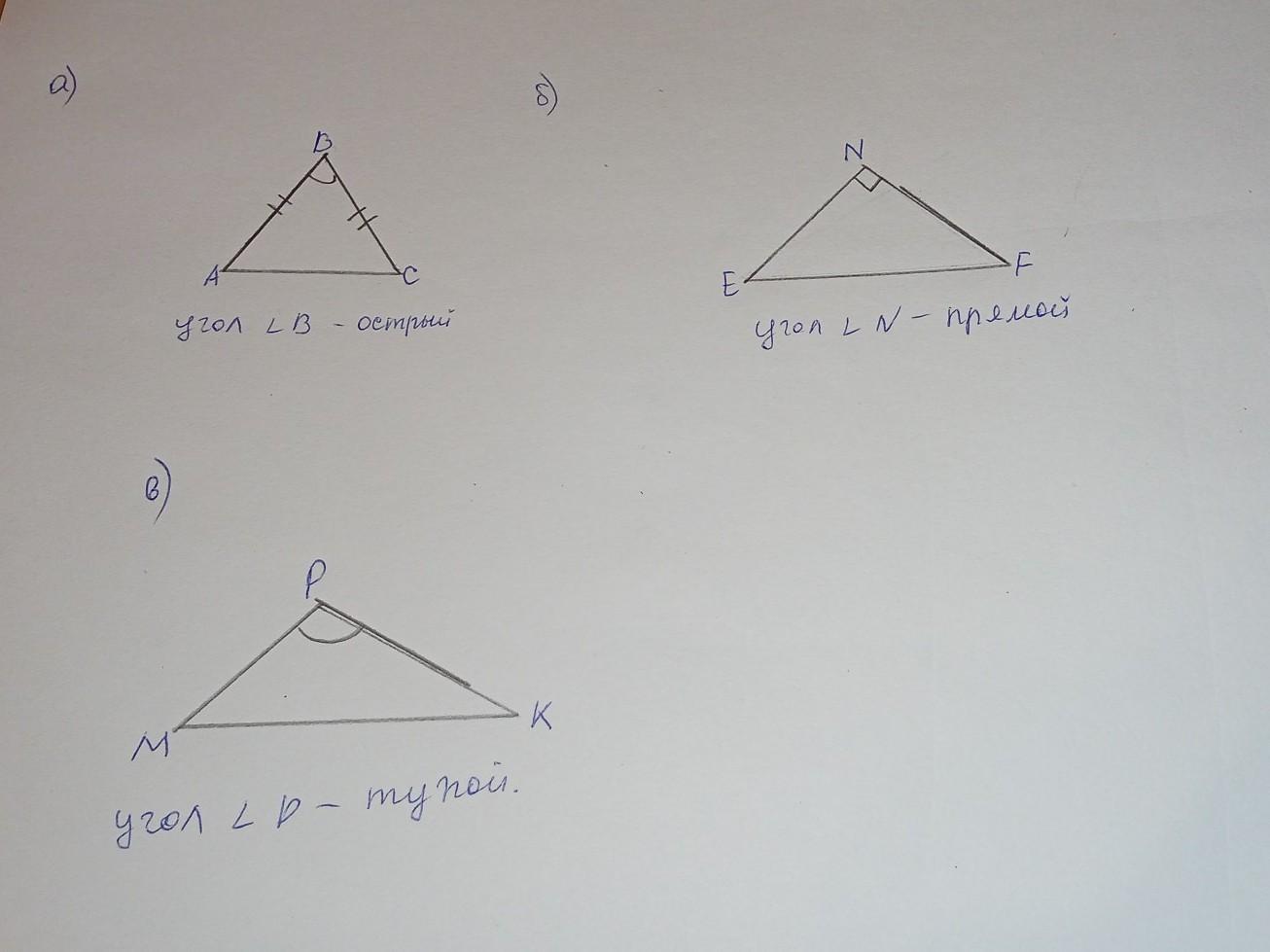 начертите три равнобедренных треугольника так чтобы угол лежащий против основания был а)острым б) прямым в) тупым