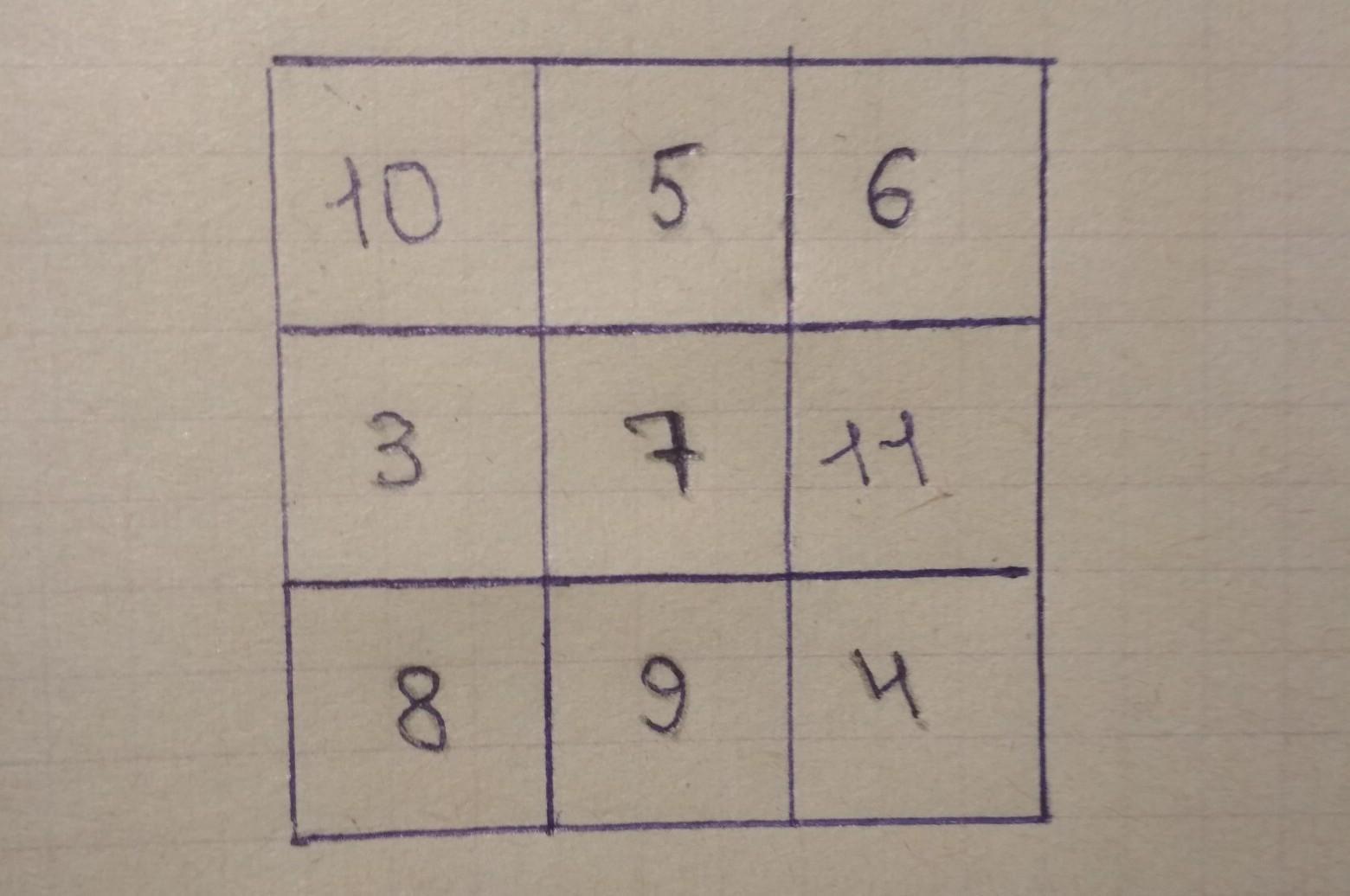 Расставьте в свободные клетки квадрата числа 3 , 4 , 5 , 6 , 7 , 8 , 9 так, чтобы суммы чисел во всех строках, столбцах и на двух диагоналях были бы равными. Какое число будет записано в нижней строке в угловой клетке справа?