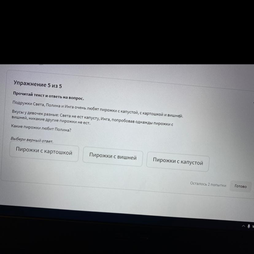 Объяснение: Инга ест только с вишней, значит, этот вариант отпадает. Света не ест капусту, остаётся вариант с картошкой, значит, Света ест пирожки с картошкой. Методом исключения понимаем, что Полина любит пирожки с капустой.