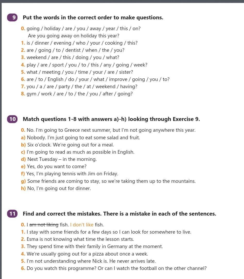2. Match questions 1-8 with answers a)-h) looking through Exercise 9.