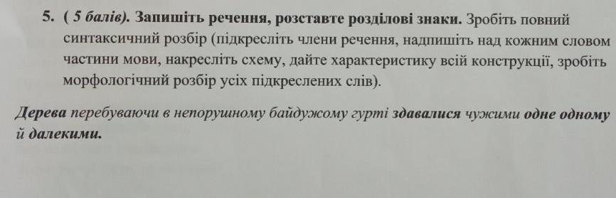 Дерева, перебуваючи в непорушному байдужому гурті, здавалися чужими одне одному й далекими. (розповідне, неокличне, просте, двускладне, поширене, повне, ускладнене діеприслівниковим зворотом)