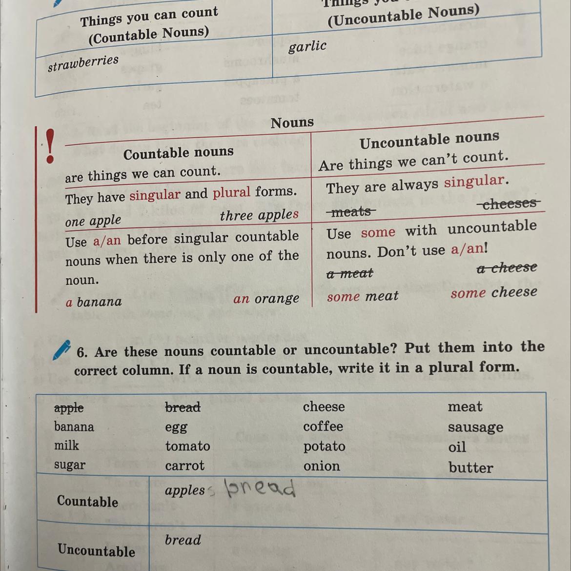 countable: apples, bananas, eggs, tomatoes, carrots, potatoes, onions, sausages