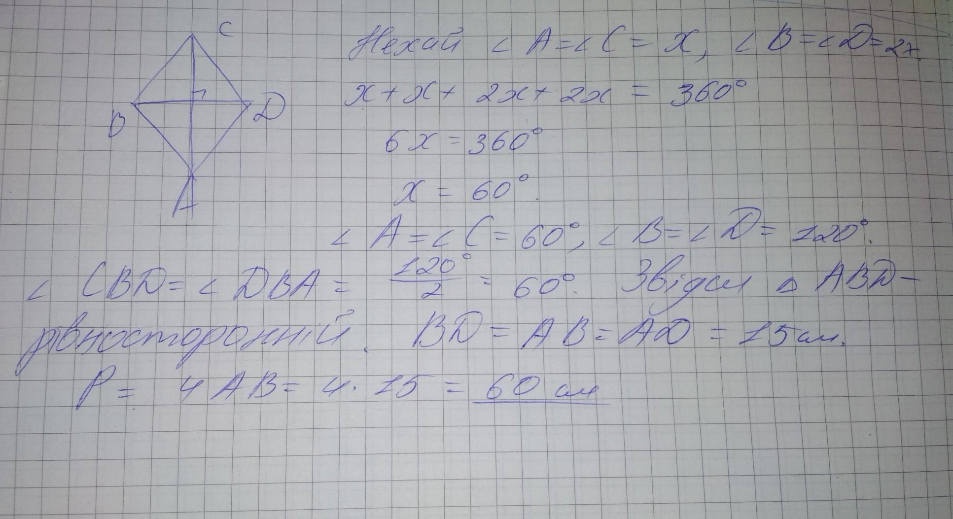 Вы, же написали что ∆ВДА- равносторонний. ВД=АД. АД=15 сторона ромба.