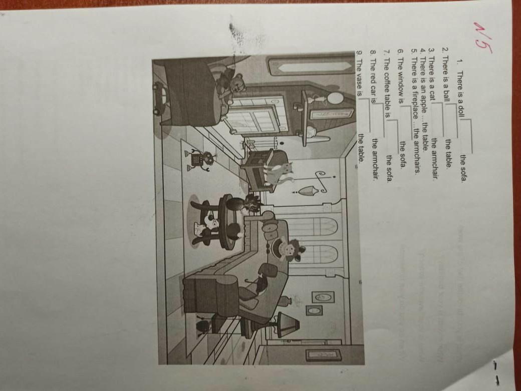 нужно вставить подходящие предлоги, чтобы обозначить расположение предметов в комнате
