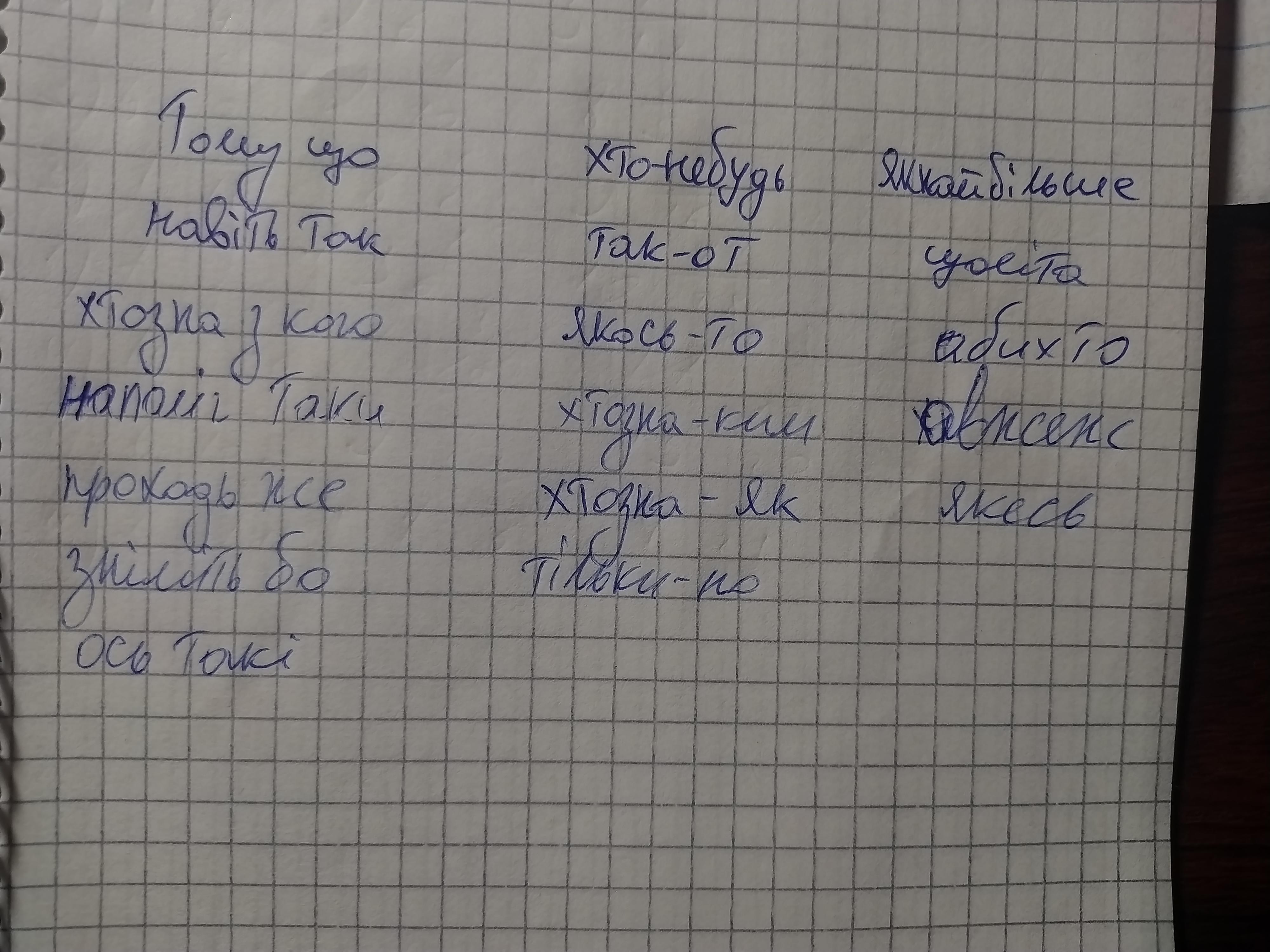 Тому(що), хто(небудь), як(най)більше, навіть(так), так(от), (що)літа, якось(то), хтозна(з)кого, хтозна(ким), аби(хто), наполіг(таки), хтозна(як), а(вже)ж, яке(сь), тільки(но), проходь(же), зніміть(бо), ось(такі).