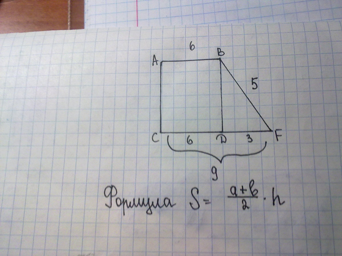 Дана прямоугольная трапеция с основаниями 6 см. и 9 см а большая боковая сторона 5 см...найти площадь этой трапеции