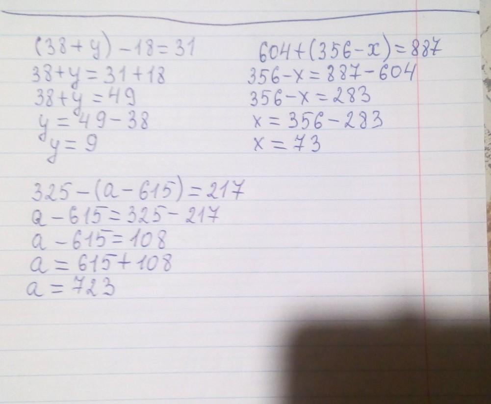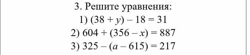 3. Решите уравнения: 1) (38 + y) - 18 = 31 2) 604 + (356 - x) = 887 3) 325 - (a - 615) = 217