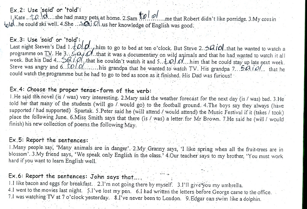 Many people say that many animals are in danger. 2. My granny says that she likes spring when all the fruit-trees are in blossom. 3. My friend says, that they speak only English in the class. 4. Our teacher says to my brother that he must word hard if he wants to learn English well.