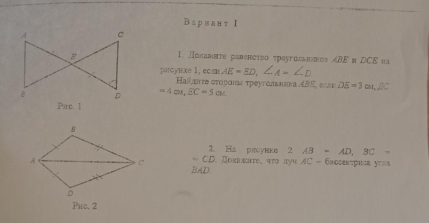 1) ΔАВЕ=ΔDCE т.к. ∠АЕВ=∠СЕD как вертикальные, ∠А=∠D, АЕ=АD по условию. Треугольники равны по 2 признаку равенства треугольников.