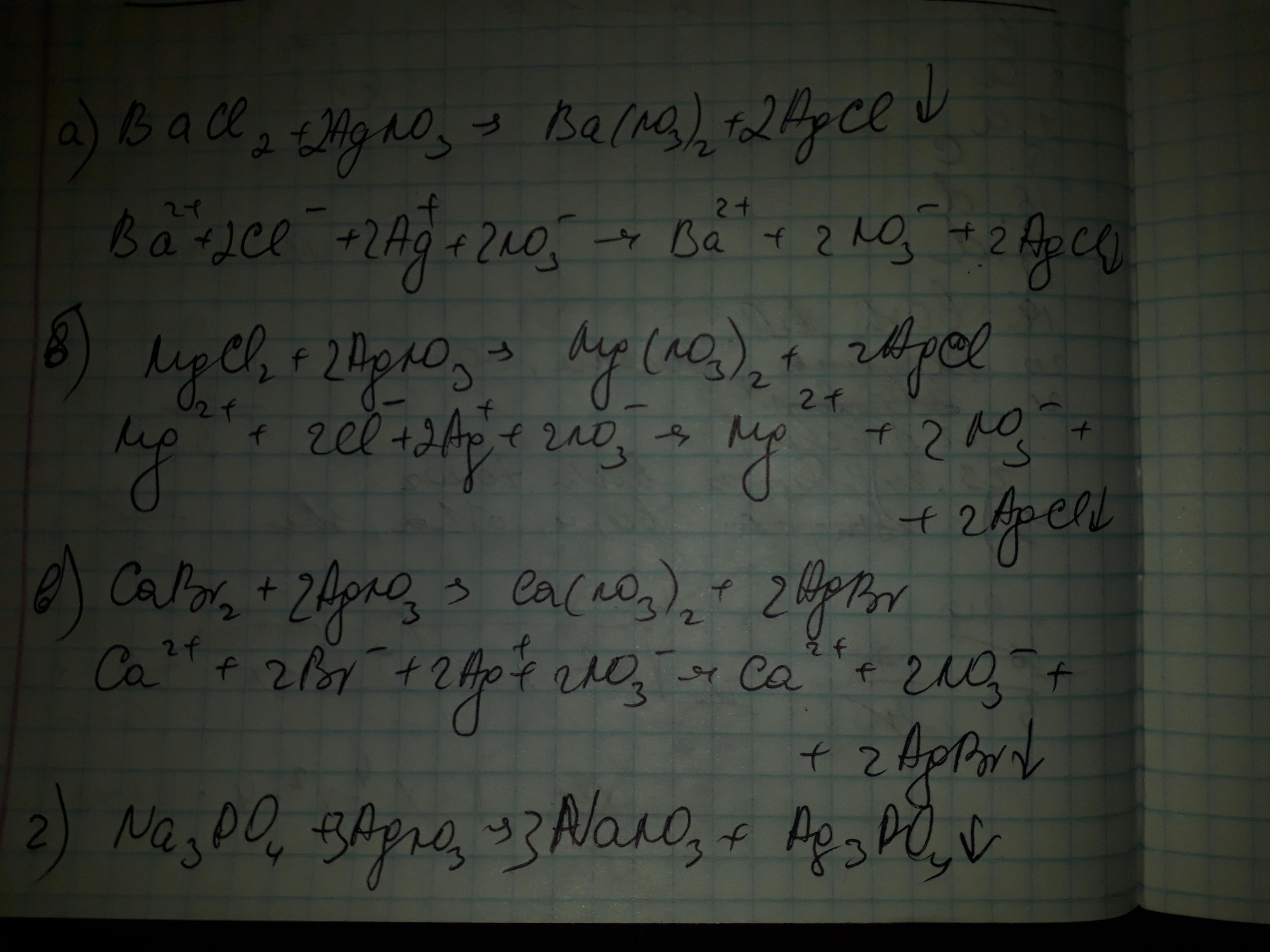 Напишіть молекулярні та йонні рівняння реакцій між: а) BaCl2 і AgNO3; б) MgI2 іAgNO3; в) CaBr2 і AgNO3; г) Na3PO4 і AgNO3 ; д)Ba(OH)2 і H2SO4; е) Na2CO3 і HNO3