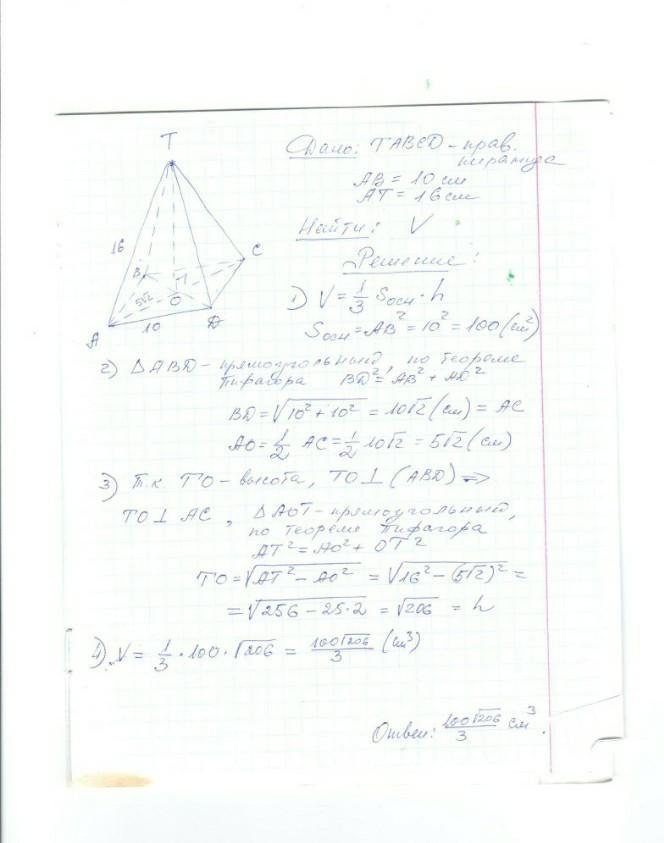 В правильной четырехугольной пирамиде боковое ребро равно 10 см, а сторона основания 16 см. Найдите апофему пирамиды.