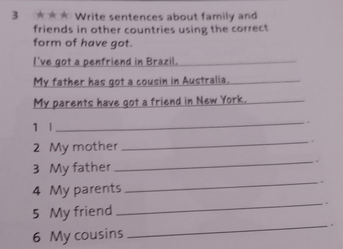 3 Write sentences about family and friends in other countries using the correct form of have got.