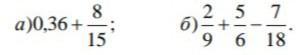 а) 36/100+8/15=9/25+8/15=27/75+40/75=67/75