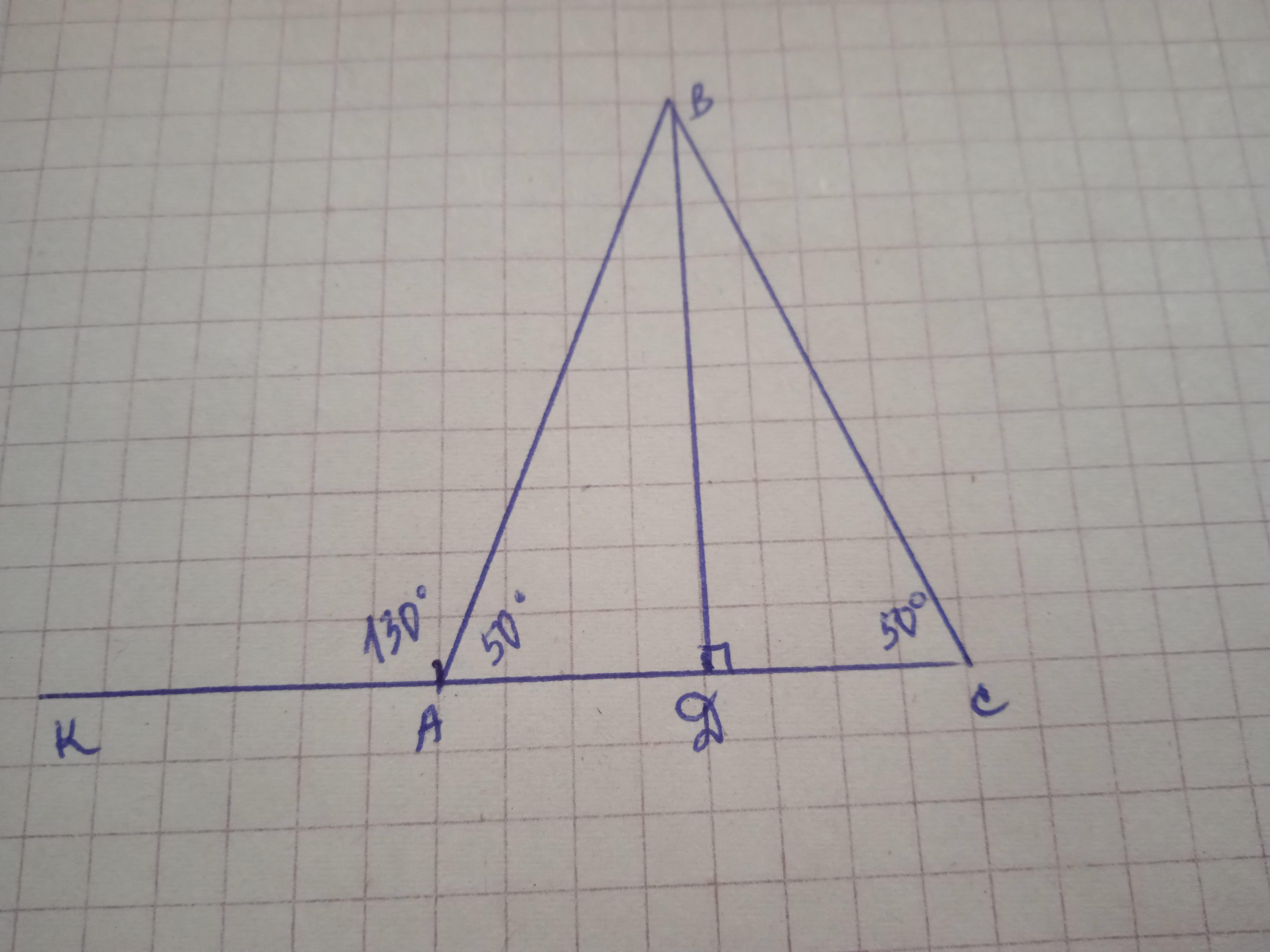 Дано: ΔАВС, АВ=ВС, ВD - медиана, ∠КАВ=130°. Найти ∠BDC и BCA.