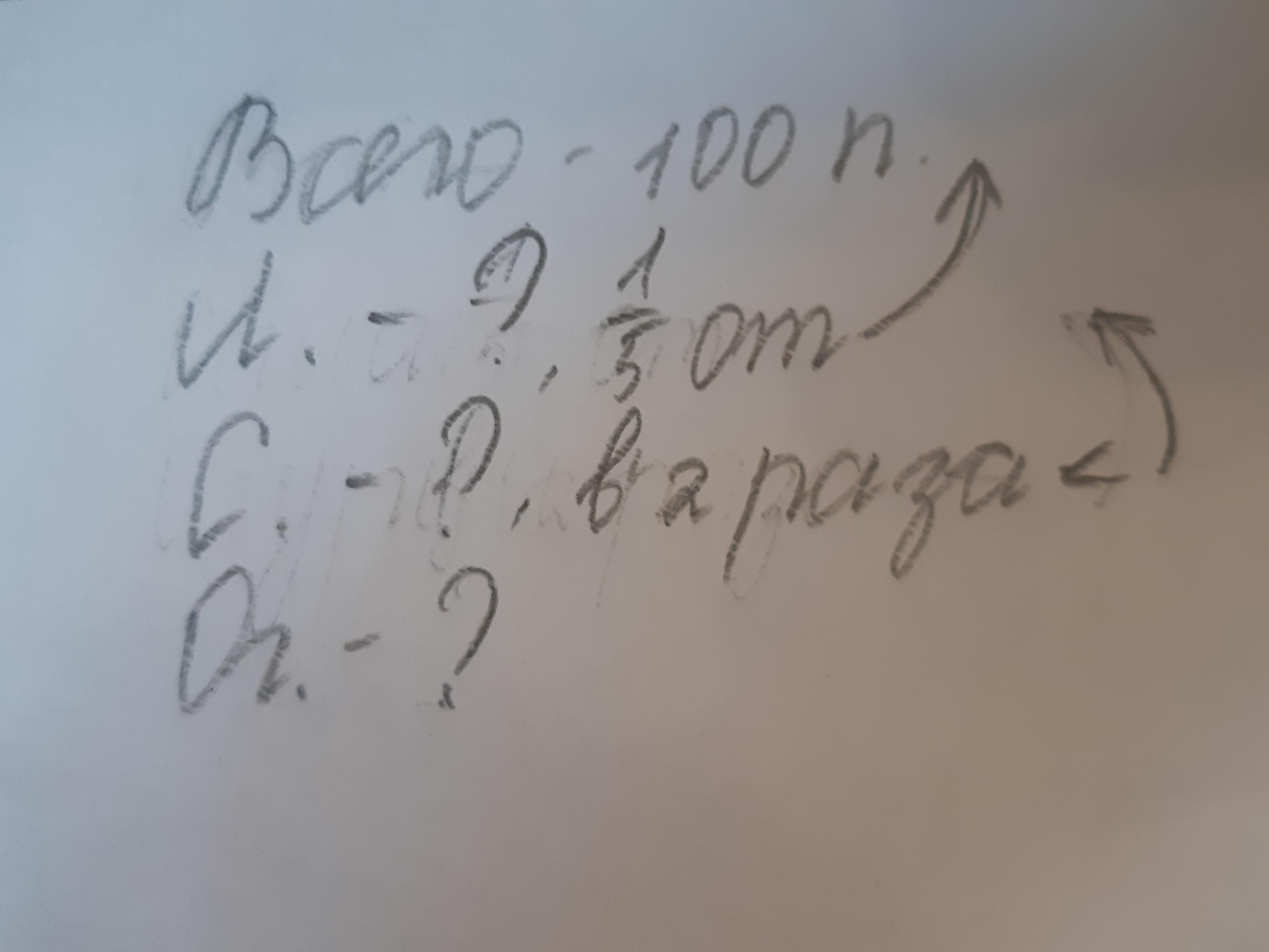 Из 100 парников пятая часть занята луком,салатом -в 2 раза меньше,чем луком,а остальные парники заняты огурцами.Поставь вопрос и реши задачу.