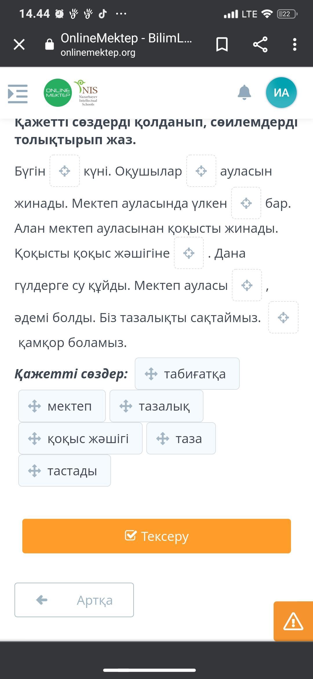 Бүгін тазалық күні. Оқушылар мектеп ауласын жинады. Мектеп ауласында үлкен қоқыс жәшігі бар. Алан мектеп ауданынан қоқысты жинады. Қоқосты қоқыс жәшігі не тастады. Дана гүлдерге су құйды. Мектеп ауласы таза, әдемі болды. Біз тазалықты сақтаймыз. Табиғатқа қамқор боламыз.