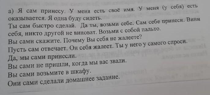 а) Мен оны өзім әкелемін. Менің атым бар. Менде (өзімде) бұл шықты. Мен жалғыз отырамын. Өзіңіз тез жасаңыз. Иә, өзіңіз үшін алыңыз. Өзіңіз әкеліңіз. Өзіңізді кінәлаңыз, басқа ешкім кінәлі емес. Өзіңізбен бірге пальтоңызды алыңыз. Өзіңіз айтыңызшы. Неге өзіңді аямайсың?
