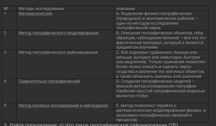 2. Установить соответствие: (5Б) № Методы исследования описание 1 Математический А. Выделение физико-географических (природных) и экономических районов — один из методов исследования географической науки. 2 Метод географического моделирования. В. Описание географических объектов, сбор образцов, наблюдение явлений — все это тот фактический материал, который и является предметом изучения 3 Метод географического районирования С. Всё подлежит сравнению: больше или меньше, выгодно или невыгодно, быстрее или медленнее. Только сравнение позволяет более полно описать и оценить черты сходства и различия тех или иных объектов, а также объяснить причины этих различий 4 Сравнительно-географический. D. Создание географических моделей — важный метод исследования географии. Наиболее простой географической моделью является глобус. 5 Метод полевых исследований и наблюдений. Е. метод позволяют перейти к математическому моделированию физико- и экономико-географических явлений и процессов.