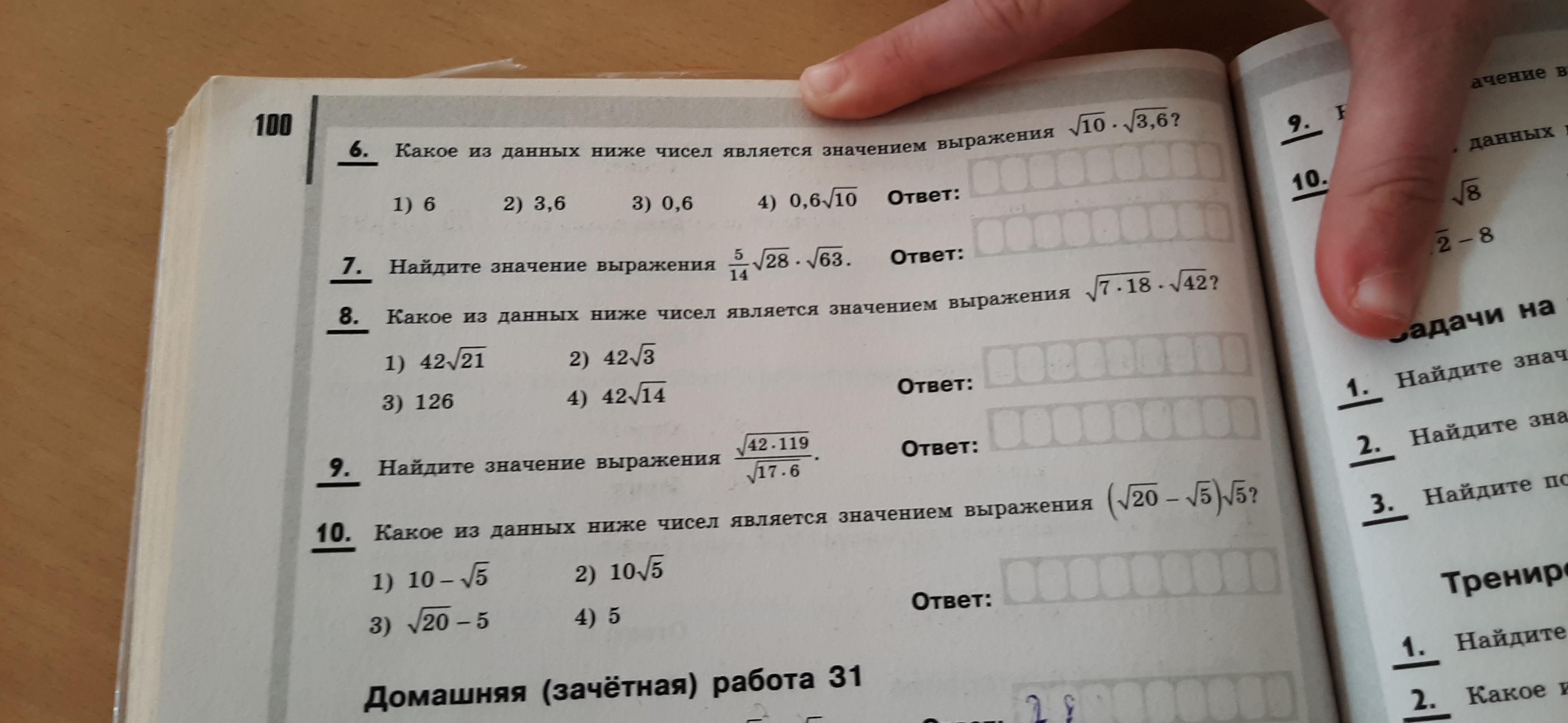 6) \sqrt{10}  \times  \sqrt{3.6}  =  \sqrt{10 \times 3.6}  =  \sqrt{36}  =6\\ 7) \frac{5}{14} \sqrt{28}   \times  \sqrt{63}  =  \frac{5}{14}  \times 2 \sqrt{7}  \times 3 \sqrt{7}  =  \frac{5}{7}  \times 7 \times 3 = 5 \times 3 = 15 \\ 8) \sqrt{7 \times 18}  \times  \sqrt{42}  =  \sqrt{5292}  = 42 \sqrt{3}  \\ 9) \frac{ \sqrt{42 \times 119} }{ \sqrt{17 \times 6} } =  \frac{ \sqrt{4998} }{ \sqrt{102} }   =  \frac{7 \sqrt{102} }{ \sqrt{102} }  = 7 \\ 10)( \sqrt{20}  -  \sqrt{5} ) \sqrt{5}  = (2 \sqrt{5}  -  \sqrt{5} ) \sqrt{5}  =  \sqrt{25}  = 5