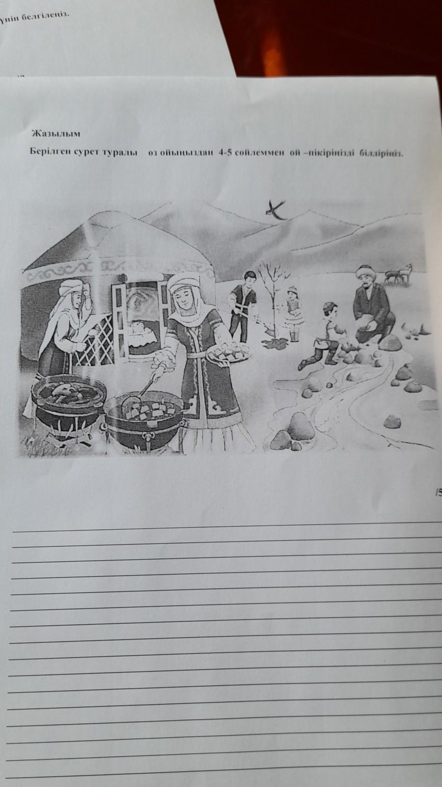 Бұл суретте көктем мезгілі келгені суреттелген. Ата мен бала өзендегі тастарды алып жатыр немесе бұлақтың көзін ашып жатыр деуге де болады. Əйелдер жағы қазан көтеріп,ет асады,бауырсақ пісіреді. Балалар ағаш отырғызады.