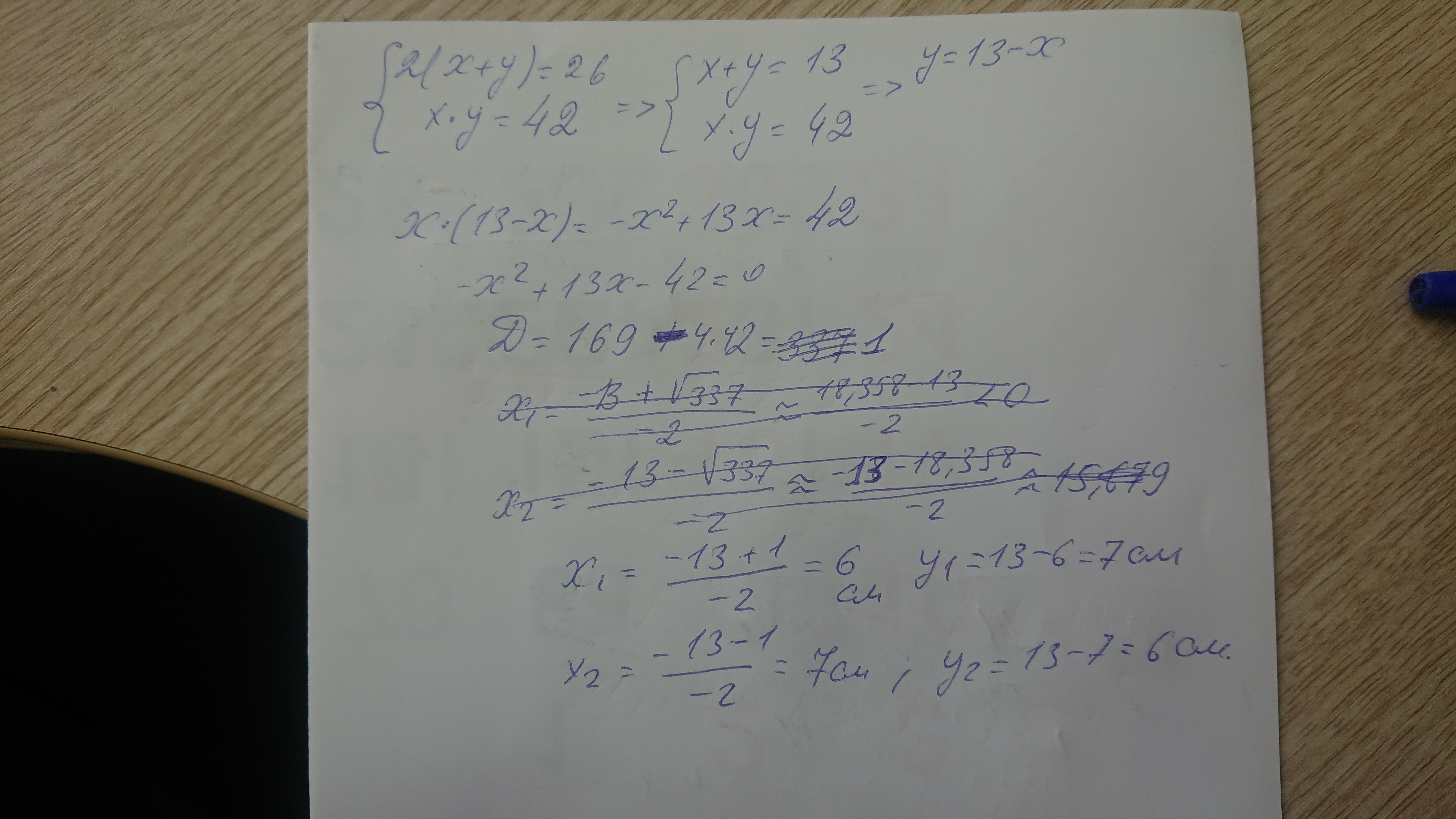 периметр прямоугольника равен 26 см, а его площадь равна 42 см². найдите стороны прямоугольника.