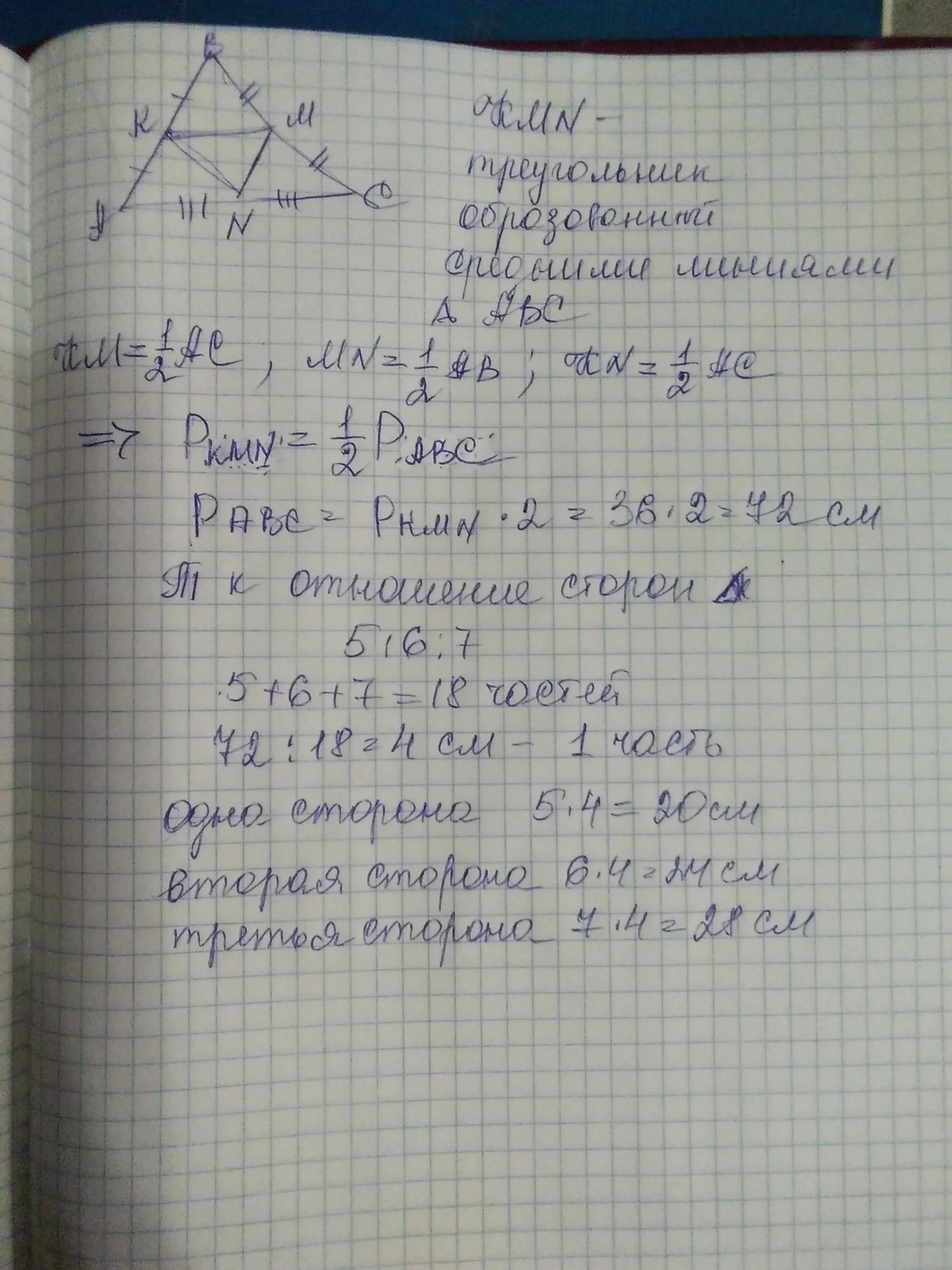 3. Стороны треугольника относятся как 5:6:7. Найдите стороны данного треугольника, если периметр треугольника, образованного его средними линиями, равен 36см. ПОМОГИТЕЕЕ