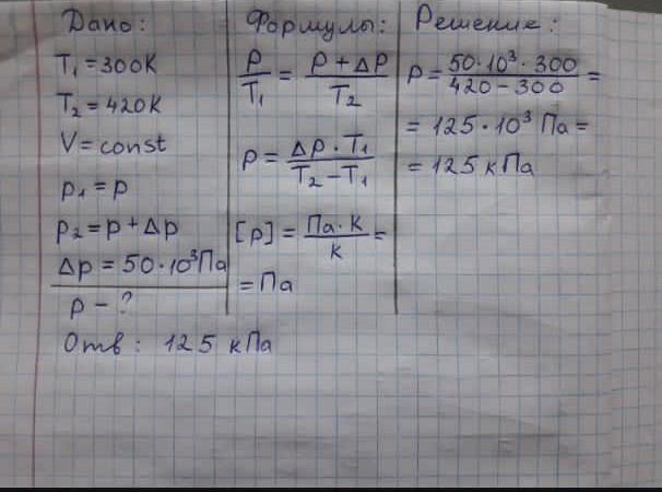 При изохорическом нагреве газа с 280К до 540К, его давление увеличилось на 39 килопаскаль. Какая была начальное давление газа?